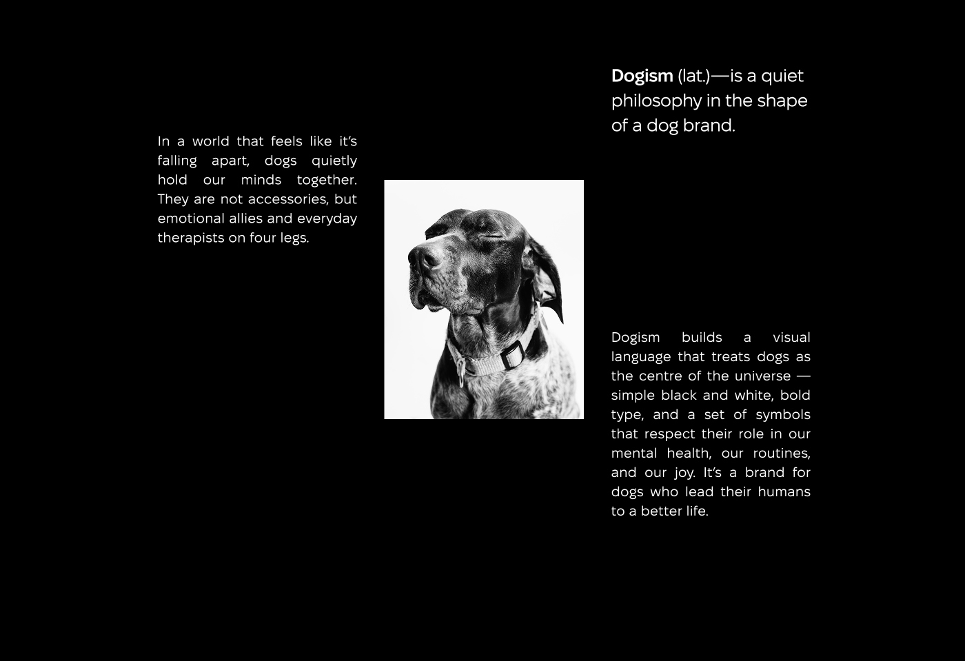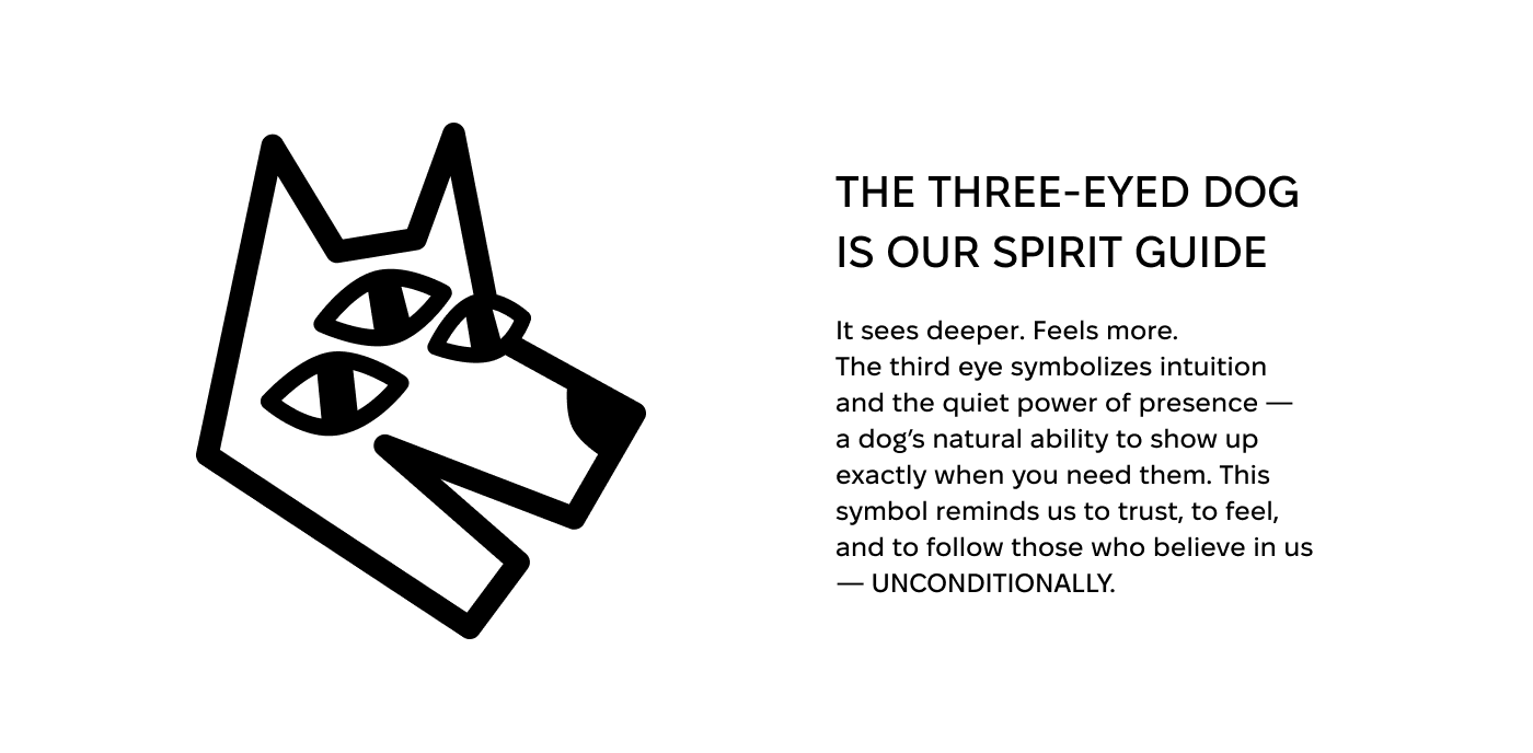 Dogism is a quiet philosophy in the shape of a dog brand. In a world that feels like it’s falling apart, dogs quietly hold our minds together. They are not accessories, but emotional allies and everyday therapists on four legs. Dogism builds a visual language that treats dogs as the centre of the universe — simple black and white, bold type and a few key symbols that honour their role in our mental health and joy. The three-eyed dog is our spirit guide. It sees deeper and feels earlier — a symbol of intuition, calm presence and that moment when a dog simply sits beside you and everything gets a little better.
